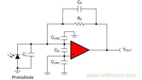 圖1:反饋電容器CF補償光電二極管接觸電容和運算放大器輸入電容