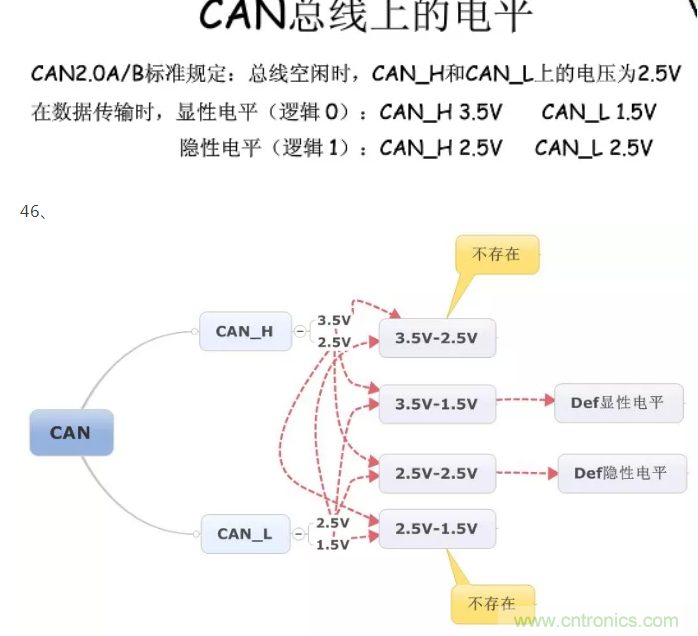 43、CAN總線(ControllerArea Network)。CAN控制器根據(jù)兩根線上的電位差來判斷總線電平,總線電平又分為顯性電平和隱性電平,二者必居其一。