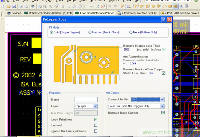 有時我們在鋪完銅之后還需要去刪除一些碎銅,現(xiàn)在可以很方便的實(shí)現(xiàn),點(diǎn)擊 Place—Polygon Pour Cutout