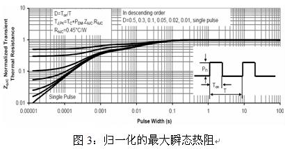 由圖3最下面一條曲線(單脈沖)可知,對于單脈沖來說,要想獲得0.015的熱阻系數(shù),其脈沖寬度不能大于20us。