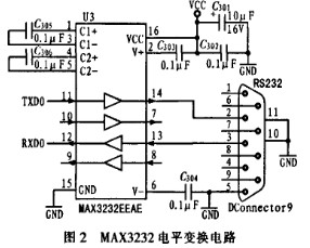 系統(tǒng)產(chǎn)生的信號需要經(jīng)過電平變換,轉(zhuǎn)換成RS-232電平,與計算機(jī)通信。這里采用MAX3232為核心電平變換電路。其原理圖如圖2所示。