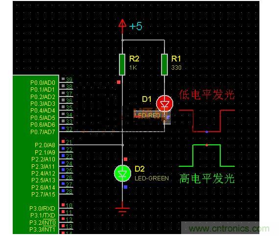 圖1中的D1、D2就可以不經(jīng)其它驅(qū)動器件,直接由單片機(jī)的引腳控制發(fā)光顯示。雖然引腳已經(jīng)可以直接驅(qū)動LED發(fā)光,但還是看看AT89C51單片機(jī)引腳的輸出能力吧。