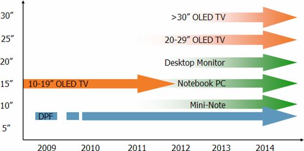 隨著技術(shù)進(jìn)步,DisplaySearch預(yù)估AMOLED將進(jìn)一步朝中大尺寸方向發(fā)展。筆記本計(jì)算機(jī)將是AMOLED廠商下一個(gè)關(guān)注的應(yīng)用方向,我們估計(jì)自2010年年中,廠商將有機(jī)會(huì)將AMOLED應(yīng)用在筆記本計(jì)算機(jī)上,而采用AMOLED面板上網(wǎng)本將有機(jī)會(huì)于2010年底開始量產(chǎn)。在TV方面,我們預(yù)期2010年底將會(huì)有大于20寸AMOLED TV被生產(chǎn),同時(shí)預(yù)期2011年大于30寸AMOLED TV 將會(huì)進(jìn)入市場(chǎng)中。
