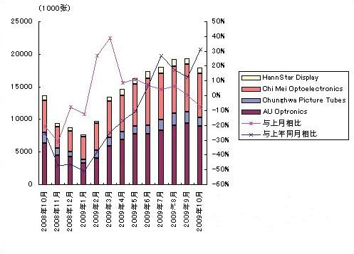 2009年10月臺(tái)灣四大型液晶面板廠商的大尺寸液晶面板供貨量比上月減少7.5%,為1788萬塊。原因是顯示器用液晶面板的負(fù)增長。雖然電視機(jī)用和筆記本電腦用液晶面板的供貨量堅(jiān)挺,但仍無法彌補(bǔ)顯示器用面板的減少。其結(jié)果,臺(tái)灣四大型液晶面板廠商的銷售額比上月減少了6.8%。這是自2009年1月以來,時(shí)隔9個(gè)月首次供貨量少于上月。