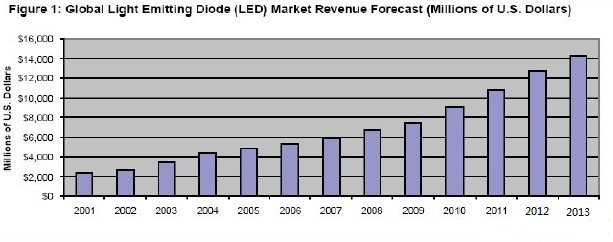 到2013 年,全球LED 市場將達(dá)到143 億美元,比2009 年增長近一倍。