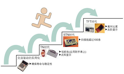 夏普公司的液晶計(jì)算器上采用的液晶顯示屏是由RCA公司生產(chǎn)的DSM(動(dòng)態(tài)散射模式) 液晶,而不是目前常見的TN(扭曲向列)模式液晶。但是,要采用DSM制造液晶電視是很困難的,這是因?yàn)镈SM的點(diǎn)陣顯示掃描線在數(shù)量方面存在一定的限制。1971年出現(xiàn)的TN 模式解決了這個(gè)問題。TN液晶能起到快門的作用,通過使液晶分子在電場中移動(dòng),就可以控制光的開/關(guān)。目前,幾乎所有液晶顯示屏都在采用這個(gè)工作原理。