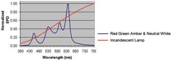 多通道驅(qū)動器:就給定的色溫而言,高質(zhì)量CRI(90以上)會需要多種類型的LED。CRI是光源的光譜能量分布(SPD)的一個函數(shù)。SPD是指給定波長(頻率)下光源的輻射量。CRI數(shù)值表現(xiàn)最好(97以上)的白熾燈工作壽命較短(750~2500小時),效率也較低(美國能源部的數(shù)據(jù)為10~17Lm/W)。圖2顯示了白熾燈的SPD曲線與RGB光源曲線的對比情況。