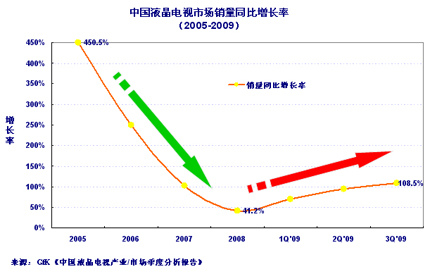 2009年,中國液晶電視市場的第一亮點就是增長速度戲劇性反彈。說增速戲劇性反彈,是因為2009年中國液晶電視的表現出乎大家預料。從2005年開始,雖然中國液晶電視市場規(guī)模一直在擴大,但增長速度卻年年縮小,2005年,中國液晶電視市場銷售規(guī)模的增速為450%,隨后基本上是每年減少一半,到2008年,增速已經下降到41%。2008年4季度,全球性經濟危機沖擊中國,所以業(yè)界對2009年中國液晶電視市場的預計基本是規(guī)模繼續(xù)擴大,增速進一步遞減,預計市場規(guī)模增速大約在20~30%之間。