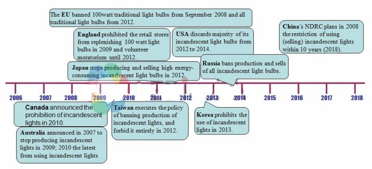 面對全球氣候變遷與不斷高漲的能源價格,各國政府都已經(jīng)開始把一些高耗能的產(chǎn)品列為首要的禁用對象,例如白熾燈泡就是最為明顯的桉例。白熾燈泡的禁用首先從歐盟與日本最先開始發(fā)酵,后來各國政府也開始陸續(xù)跟進。從各國禁用白熾燈泡的時間表來觀察,LEDinside表示,2012年之后,大多數(shù)國家開始逐步禁用白熾燈泡,也為LED照明帶來龐大的商機。