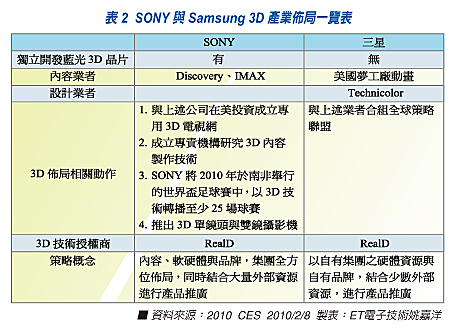 然而,消費(fèi)者要的不是一臺(tái)高科技電視,更要豐富的閱聽內(nèi)容。以3D影像產(chǎn)業(yè)而言,除了需要強(qiáng)大硬體裝置支援外,其豐富的3D內(nèi)容支援也是相當(dāng)重要的。09年的CES展,許多大廠開始拉攏平臺(tái)與內(nèi)容業(yè)者一同站臺(tái),因?yàn)樗麄冎拦馐侵挥杏搀w不能讓消費(fèi)者買單,多元的加值服務(wù)才是消費(fèi)性電子未來的趨勢(shì)。2010年的CES展,同樣也是依循前年的模式,而且力道更加強(qiáng)勁,以補(bǔ)強(qiáng)各自提出自有的硬體解決方案。另一方面,以SONY與三星來說,兩家公司同時(shí)都與RealD技術(shù)合作以獲取3D的專利技術(shù),以避免專利侵權(quán)的問題發(fā)生,就以產(chǎn)業(yè)現(xiàn)況來看,頗有烘抬3D產(chǎn)業(yè)的味道(見表二)。