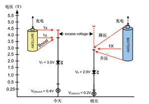 未來,新型鋰離子電池和LED技術(shù)將會為LED驅(qū)動帶來新的挑戰(zhàn)。配合最新的化學(xué)成果,電池電壓的范圍將擴(kuò)大到2.3~4.7V,而典型的白光LED正向電壓將會下降至2.9V。與此同時,輸出驅(qū)動器的飽和電壓都會隨著下降。當(dāng)采用并聯(lián)驅(qū)動時,要高效地驅(qū)動一個2.9V的LED,就需要動用一個升降壓轉(zhuǎn)換器。圖2所示為由電池、驅(qū)動器和LED技術(shù)的進(jìn)步所帶來的效果。