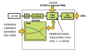 使用RGB背光時,當(dāng)LED溫度改變時,驅(qū)動器必須更正紅、綠和藍(lán)三主色間的亮度平衡,以防出現(xiàn)白點(diǎn)位移。此外,還需保證驅(qū)動器在任何操作溫度下維持光的正確強(qiáng)度。而在補(bǔ)償方面,可以用閉環(huán)或開環(huán)形式。若使用閉環(huán)補(bǔ)償,便需采用感光器來測量白點(diǎn)和其強(qiáng)度。相反地,如使用開環(huán)補(bǔ)償,那溫度便需事先量度出來,并通過預(yù)先定義好的補(bǔ)償曲線來調(diào)節(jié)亮度的平衡。