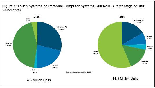 最近幾年,個(gè)人電腦市場對于觸摸屏的需求不斷增長,2008和2009年增長率超過20%,快于總體系統(tǒng)市場。但與該市場2010年462%的增長率相比,上述增長速度就相形見絀了。平板觸摸電腦是PC觸摸革命中的主要初期推動(dòng)者,預(yù)計(jì)占PC觸摸市場的比例將從2009年的3.8%銳升到56.2%,而總體PC觸摸市場規(guī)模將擴(kuò)大兩倍。