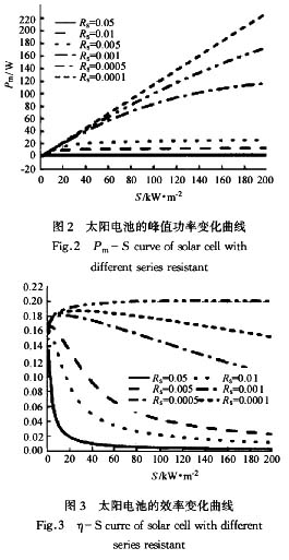 由前面太陽電池的等效電路可以看出,串聯(lián)內(nèi)阻會(huì)降低短路電流,降低負(fù)載兩端的電壓,引起電池轉(zhuǎn)換效率的下降。圖2和圖3分別為不同串聯(lián)內(nèi)阻的太陽電池峰值功率和轉(zhuǎn)換效率隨光強(qiáng)的變化規(guī)律。從圖中可以看出,隨著光強(qiáng)的增加,串聯(lián)電阻的影響越來越顯著,串聯(lián)內(nèi)阻越高,隨著光強(qiáng)的升高,其轉(zhuǎn)換效率下降的越快。