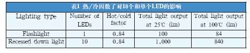 乍一看,16%的LED光通減少量影響可能不大。然而,當(dāng)考慮到一個(gè)照明裝置由多個(gè)LED組成時(shí),這個(gè)問題就嚴(yán)重了。用10個(gè)LED組成的嵌筒燈同一個(gè)LED組成的手電筒比較,熱/冷因數(shù)的影響就顯現(xiàn)出來(lái)了。