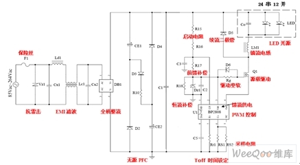 以AC176V—264V全電壓輸入為例,采用BP2808為主芯片來(lái)設(shè)計(jì)負(fù)載為小功率多顆LED光源多串、多并的LED日光燈時(shí),整個(gè)系統(tǒng)方案的設(shè)計(jì)方框圖如圖1所示。全電路由抗浪涌/雷擊保護(hù)、EMI濾波、全橋整流、無(wú)源功率因素校正(PPFC)、啟動(dòng)電壓(包括前饋補(bǔ)償、開(kāi)機(jī)后的饋流供電、驅(qū)動(dòng)變軟)、恒流補(bǔ)償、PWM控制、源極驅(qū)動(dòng)、LED光源陣列,以及采樣電阻、Toff時(shí)間設(shè)定、儲(chǔ)能電感、續(xù)流二極管等各部分組成。