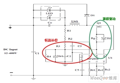專(zhuān)利的源極驅(qū)動(dòng)電路由MOS管Q1、D6、Rg、Rt、Rcs與BP2808內(nèi)部電路組成,其顯著特點(diǎn)是有效降低功耗、提高恒流精度。源極驅(qū)動(dòng)方式的驅(qū)動(dòng)電路使系統(tǒng)消耗電流減少,尤其是減少了傳統(tǒng)的高壓差供電通路中類(lèi)似R15-17上的電流,從而降低了功耗,提高了效率。D6、Rg可使開(kāi)關(guān)開(kāi)通驅(qū)動(dòng)變軟,關(guān)斷驅(qū)動(dòng)保持較強(qiáng),既改善EMI,又盡量不犧牲效率。與LED光源并聯(lián)的輸出濾波電容C0用以減少LED光源上的電流紋波。