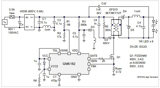 圖一GM6182高功因、高效率、具有EZDimming功能的LED驅(qū)動器