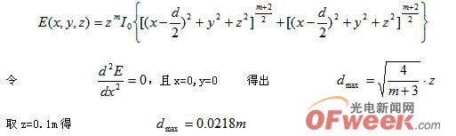 d增加到0.0218時(shí),原點(diǎn)附近的區(qū)域的光照度不至下降很多,此距離比較合適。通過(guò)仿真可以驗(yàn)證計(jì)算結(jié)果,如圖1所示,當(dāng)d=0.0218m時(shí),原點(diǎn)附近照度較均勻。 [page]