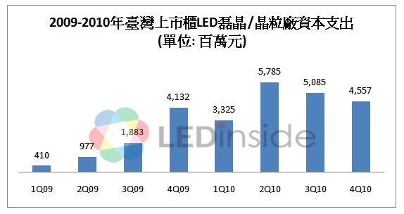 2010年由于受惠于LED背光源與LED照明需求明確加溫,產(chǎn)能用率攀升,臺廠大幅擴充資本支出,積極提高資本支出以擴增產(chǎn),至2010年底,臺灣地區(qū)廠商的資本支出總額達(dá)217.6億元,比2009年的資本支出總額成長達(dá)2.32倍,如下表所示。