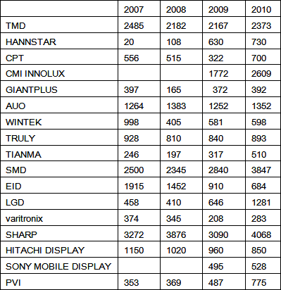最后,中小顯示屏行業(yè)在一年內(nèi)也經(jīng)歷了比較大的變動。華映(CPT)和彩晶(HANNSTAR)徹底轉(zhuǎn)型為中小顯示屏廠家。CPT在2010年出貨量高達(dá)3.52億片,比2009年增長135%;HANNSTAR在2010年出貨量高達(dá)2.48億片,比2009年增長505%。雖然出貨量大增,但是平均單價不高,毛利低。加上TFT-LCD生產(chǎn)線的高額折舊費用,這兩個廠家還處于虧損的泥潭之中。