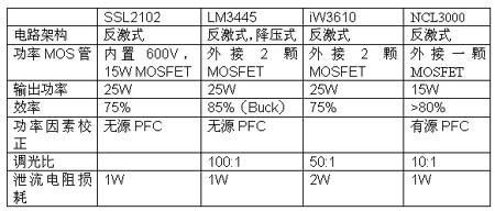 目前市場上主要有恩智浦的SSL2101/2,國半的LM3445,iWatt的iW3610和OnSemi的NCL3000四種兼容可控硅調(diào)光的驅(qū)動IC。其特點(diǎn)如下: