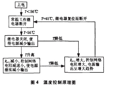 處于斷開(kāi)狀態(tài),此時(shí)控制電路中只有W1起控制作用,設(shè)定常溫工作總電流恒定為1.60A。當(dāng)繼電器溫度上升到56℃時(shí),Kt自動(dòng)閉合,整個(gè)控制電路開(kāi)始工作,以減小恒流電源的輸出;當(dāng)溫度降低到45℃時(shí),Kt自動(dòng)斷開(kāi),電源額定輸出。該過(guò)程可用圖4表示,圖中T為Kt的溫度,Rntc為NTC的阻值。
