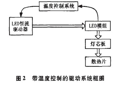 此方案通過(guò)控制驅(qū)動(dòng)器的輸出電流來(lái)實(shí)現(xiàn)對(duì)LED燈的溫度控制。圖2為恒流驅(qū)動(dòng)器驅(qū)動(dòng)LED燈框圖,驅(qū)動(dòng)器輸出到LED模組,LED模組上產(chǎn)生的熱量通過(guò)良好的導(dǎo)熱材料傳導(dǎo)到燈芯板,最后經(jīng)由散熱片散熱到大氣中。當(dāng)外界散熱環(huán)境惡劣時(shí),LED模組的溫度會(huì)達(dá)到溫度控制系統(tǒng)設(shè)定的溫度,得到反饋的信息后,驅(qū)動(dòng)器減少輸出,達(dá)到限制并降低LED模組溫度的目的。