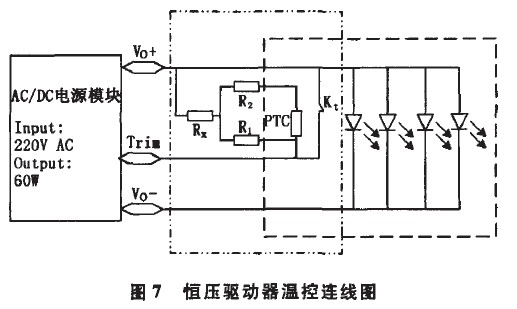圖7為恒壓驅(qū)動(dòng)器溫控的連線圖。Trim端用來(lái)調(diào)節(jié)電源的輸出。左側(cè)點(diǎn)線型虛線框中部分為控制電路,其中:PTC為正溫度系數(shù)溫敏電阻;R1、R2、R,均為普通電阻,與PTC溫敏電阻匹配調(diào)節(jié)驅(qū)動(dòng)器輸出電壓;Kt為常閉型溫度繼電器,其斷開(kāi)溫度為60℃,自動(dòng)閉合溫度為48%。右側(cè)虛線框中部分為L(zhǎng)ED模塊部分。Kt和PTC安裝在LED模塊上,并與模塊緊密接觸。常溫下Kt處于閉合狀態(tài),此時(shí)控制電路中控制驅(qū)動(dòng)器額定輸出,該LED模組常溫工作額定總電壓為24V。當(dāng)繼電器溫度上升到60℃時(shí)Kt