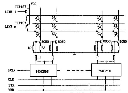 常規(guī)型驅(qū)動電路的設(shè)計一般是用串入并出的通用集成電路芯片如74HC595或MC14094 等作為列數(shù)據(jù)鎖存,以8050 等小功率NPN 三極管為列驅(qū)動,而以達(dá)林頓三極管TIP127等作為行掃描管,其電路如圖1 所示。