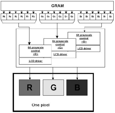 通過嚴(yán)格控制和改變液晶上所施加的電壓,每種子像素呈現(xiàn)不同的灰階。在結(jié)合了這三種子像素后,可以得到一個(gè)可以顯示不同顏色的顯示屏。