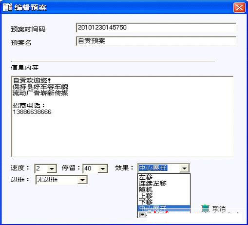 ★ 文本顯示方式有左移,下移,畫(huà)卷展開(kāi)等多種效果,速度30級(jí)可調(diào)、停頓時(shí)間50級(jí)可調(diào)。