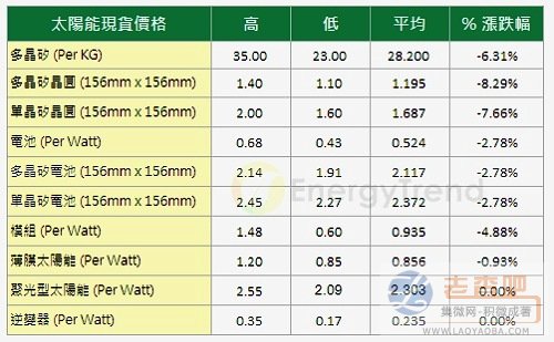 而在電池方面,最低價(jià)格仍來(lái)到每瓦0.43美元,平均價(jià)格則滑落到每瓦0.524美元,跌幅為2.78%;另外在模組方面,雖然矽晶太陽(yáng)能模組的平均價(jià)格持續(xù)下滑到每瓦0.935美元,跌幅為4.88%;而薄膜部分也是下滑的狀況,平均價(jià)格來(lái)到0.856美元,跌幅為0.93%。