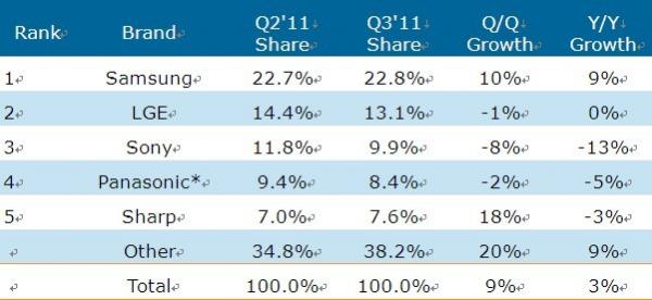 2011年第三季三星全球平板電視營收占比微幅提高,為22.8%,遠(yuǎn)遠(yuǎn)領(lǐng)先第二大品牌商樂金電子。就營收而言,除了在日本沒有出售電視,三星在全球其他各個(gè)地區(qū)營收第一,在亞太地區(qū)和拉美地區(qū)領(lǐng)先于樂金電子。三星液晶電視和等離子電視營收居于首位,CRT電視居第二位,并是五大品牌商中唯一一家營收同比成長(zhǎng)的品牌商。