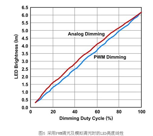 此外,驅(qū)動器可達(dá)到較高的光電轉(zhuǎn)換效率,這表示耗用相同的電力可達(dá)到更高的流明。然而,模擬調(diào)光也有深度調(diào)光的某些電流準(zhǔn)確度問題,此因回饋調(diào)節(jié)電壓或電流汲入電壓過小,而無法準(zhǔn)確控制,此乃受限于錯誤放大器的偏移電壓所致。亮度線性及色度也不比PWM調(diào)光,尤其是在深度調(diào)光時(圖5)。事實上,除非將兩個相同的顯示器并置進行比較,否則一般人很難辨別色度或線性的差異。
