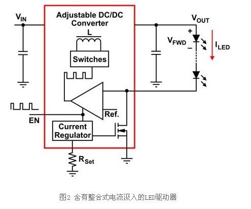 為了進行PWM調(diào)光,數(shù)字信號處理器(DSP)或微控制器(MCU)會傳送不同負(fù)載周期(D)的PWM訊號,以針對圖1所示的驅(qū)動器啟用及停用WLED驅(qū)動器的轉(zhuǎn)換器,或針對圖2所示的驅(qū)動器啟用及停用電流汲入。因此,通過WLED串行的平均電流等于負(fù)載周期乘以最大電流,亦即ILEDavg = D×ILEDmax。