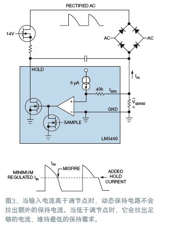 獲得效率最大化的最佳方式是調節(jié)最低輸入電流。采用這種方法時,當輸入電流高于調節(jié)點時,不會拉出額外的保持電流。當輸入電流低于調節(jié)點時,電路會拉出足夠的電流以維持最小的保持要求,LM3450控制器實現(xiàn)了這種方法,叫做動態(tài)保持(圖3)。它在二極管橋回返以及系統(tǒng)地之間有一只檢測電阻,提供了一種輸入電流的檢測方法。通過電阻上檢測到的電壓,控制器就可以線性地從保持管腳拉出電流,以維持最小的調節(jié)輸入電流。這樣就確保了額外功耗處于最小值狀態(tài)。