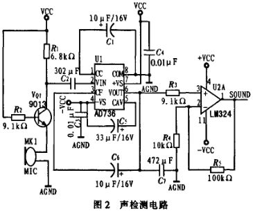 從麥克風(fēng)接收到信號(hào)后由三極管9013初次放大,然后由集成放大器LM324的兩級(jí)放大,得到交流電壓。由于模數(shù)轉(zhuǎn)換時(shí)需要直流電壓值,所以再通過萬用表交直流轉(zhuǎn)換電路,選用整流芯片AD736,使用單電壓供電低阻抗電路。