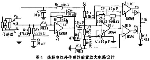 熱釋電紅外傳感器能以非接觸形式檢測(cè)出人體輻射的紅外線,并將其轉(zhuǎn)變?yōu)殡妷盒盘?hào)。本設(shè)計(jì)所采用的是PIR熱釋電傳感器,安裝有菲涅爾透鏡,感應(yīng)距離7 m,感應(yīng)角度110°。具有全自動(dòng)感應(yīng)、光敏控制、兩種觸發(fā)方式(不可重復(fù)觸發(fā)方式,可重復(fù)觸發(fā)方式)、靈敏度高、微功耗等特點(diǎn)。當(dāng)人進(jìn)入其感應(yīng)范圍,則輸出高電平,人離開感應(yīng)范圍,則自動(dòng)延時(shí)關(guān)閉高電平,輸出低電平。但是該熱釋電紅外傳感器只能檢測(cè)到動(dòng)態(tài),所以對(duì)于長(zhǎng)時(shí)間處于相對(duì)靜態(tài)的存在無法檢測(cè)的缺陷。熱釋電紅外傳感器前置放大電路如圖4所示。