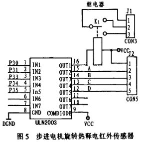 為此,采用了步進(jìn)電機(jī)模塊。設(shè)計(jì)中,將熱釋電紅外和步進(jìn)電機(jī)固定一起。單片機(jī)P1.0~P1.3口分別經(jīng)過74LS14雙上升沿D觸發(fā)器電平轉(zhuǎn)換后,通過芯片ULN2003驅(qū)動(dòng)步進(jìn)電機(jī)旋轉(zhuǎn)(電路設(shè)計(jì)如圖5),從而可以旋轉(zhuǎn)熱釋電紅外傳感器,檢測(cè)到靜態(tài)。