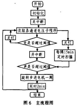 本系統(tǒng)以單片機(jī)AT89S52為核心,采用光照檢測(cè)、聲控以及步進(jìn)電機(jī)旋轉(zhuǎn)熱釋電紅外等傳感器進(jìn)行環(huán)境探測(cè)。系統(tǒng)首先啟動(dòng)可見光模塊,通過光一流一壓轉(zhuǎn)換后,經(jīng)過A/D轉(zhuǎn)化為數(shù)字量并通過液晶顯示。若是電壓較小,說明了亮度不夠,則繼續(xù)檢測(cè)聲音。若是聲音較大,則在短時(shí)間內(nèi)調(diào)用步進(jìn)電機(jī)模塊,檢測(cè)是否有人;否則,每隔15 min定時(shí)檢測(cè)。因?yàn)樵趯?shí)際過程中,設(shè)置聲光的閾值都缺乏直觀性,所以使用液晶電壓顯示進(jìn)行判斷。光、聲的閾值可以根據(jù)不同地方的實(shí)際情況通過軟件進(jìn)行調(diào)整。