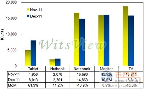 監(jiān)視器面板出貨量為1,607萬片,月增0.9%;筆記型電腦面板出貨量為1,486萬片,月減10.9%。平板電腦方面,WitsView指出,蘋果(Apple)新一代 iPad 3 面板,持續(xù)受到生產(chǎn)良率問題,造成目前供貨量依然受到限制,但華南地區(qū)對于山寨平板電腦需求,依舊強(qiáng)勁,整體平板電腦面板出貨較11月增加61.9%,出貨量來到801萬片。小筆電用面板出貨量則來到230萬片,較上月增加11.2%。