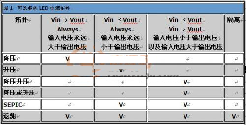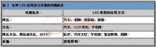 如同表2所示,LED已廣泛運(yùn)用于各領(lǐng)域,因此需要許多種類的電源拓?fù)?,支持LED的應(yīng)用。一般而言,必須考慮輸入電壓、輸出電壓及對(duì)隔離的需求,以做出適當(dāng)選擇。