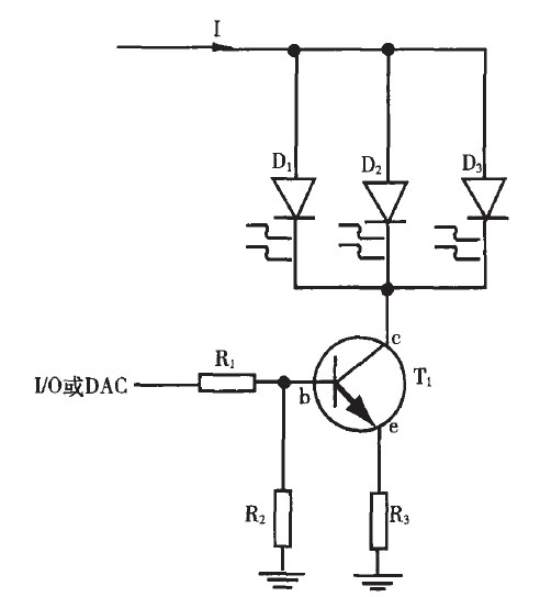圖中, D1, D2, D3 為發(fā)光二極管, T1 為NPN 型三極管, R1 , R2 , R3 的阻值可根據(jù)總電流I 的設(shè)計(jì)要求進(jìn)行調(diào)節(jié), I/O 或DAC 為控制端口。