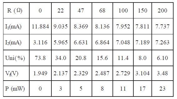 計(jì)算機(jī)利用對(duì)分法算出了在總電流為15mA,外加偏置電阻(R)為R4=R5=0 , 22 , 47 , 68 , 100 , 150, 200 (Ω) 時(shí), D1 和D2 的電流( I1 和I2) 、亮度均勻性( Uni)、正向電壓(V5) 、以及偏置電阻帶來的功耗(P)。