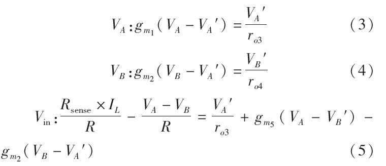 的微小值。由式(6)可以看出,當(dāng)gm1ro2或gm2越大,VA與VB的匹配度越高,電流采樣越精確。值得注意的是,式中出現(xiàn)gm1ro3的平方項(xiàng),這意味著可以用較小的增益達(dá)到高精度。但是,耐壓5 V的低壓管無法在高輸入電壓下正常工作,電路中必須使用大量耐壓40 V的高壓管。然而高壓管的增益與等效輸出電阻很低,無法滿足電流采樣電路的精度要求。