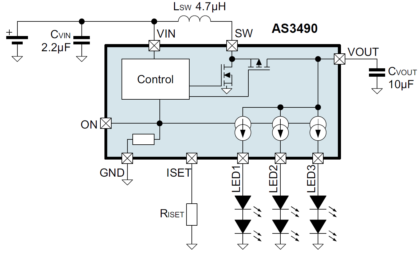 軟啟動的特點(diǎn)使AS3674更容易集成到對噪音敏感的無線射頻系統(tǒng)中。AS3674由兩組輸入電路控制,也可用介于100-800赫茲的PWM電路控制,實(shí)現(xiàn)1:2000的調(diào)光比。單通道兩個(gè)LED的配置結(jié)合2 MHz的轉(zhuǎn)換器操作頻率,實(shí)現(xiàn)使用諸如4.7µH電感的微小外部組件并取得優(yōu)于競爭對手最高達(dá)6%的高效率。