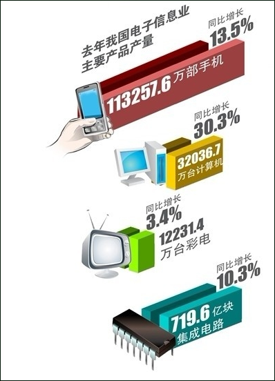 近日,工信部發(fā)布《2011年電子信息產(chǎn)業(yè)統(tǒng)計公報》,在2011年,我國彩電、手機(jī)、計算機(jī)等主要電子產(chǎn)品產(chǎn)量占全球出貨量的比重分別達(dá)到48.8%、70.6%和90.6%,均名列世界第一。
