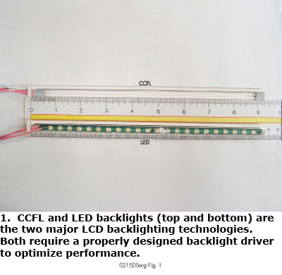 典型的LCD背光可以是1個或多個冷陰極熒光燈(CCFL),或是一組發(fā)光二極管(LED)陣列。圖1分別給出了采用這兩種技術的一個例子。背光圖像的質(zhì)量在很大程度上取決于背光驅(qū)動器。在本文中,我們將討論有助于CCFL和LED發(fā)展的一些注意事項,以及如何為這兩種背光供電。