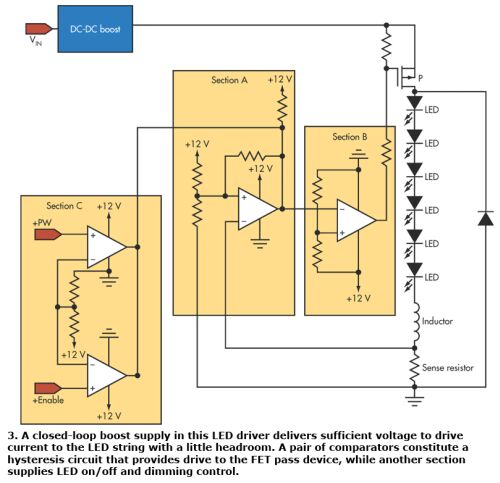DC-DC升壓變換器是一個閉環(huán)升壓電源,它提供了足夠的電壓(至少2V的余量)來驅(qū)動流向LED串的電流。圖中A部分顯示了一個比較器及構(gòu)成正向滯后電路的相關電阻。圖中將感測電阻上的電壓與一個已知參考值作比較。圖中B部分給出了另一個比較器和用于緩沖A部分輸出相關電阻,以確保正確的滯后處理并驅(qū)動直通器件。